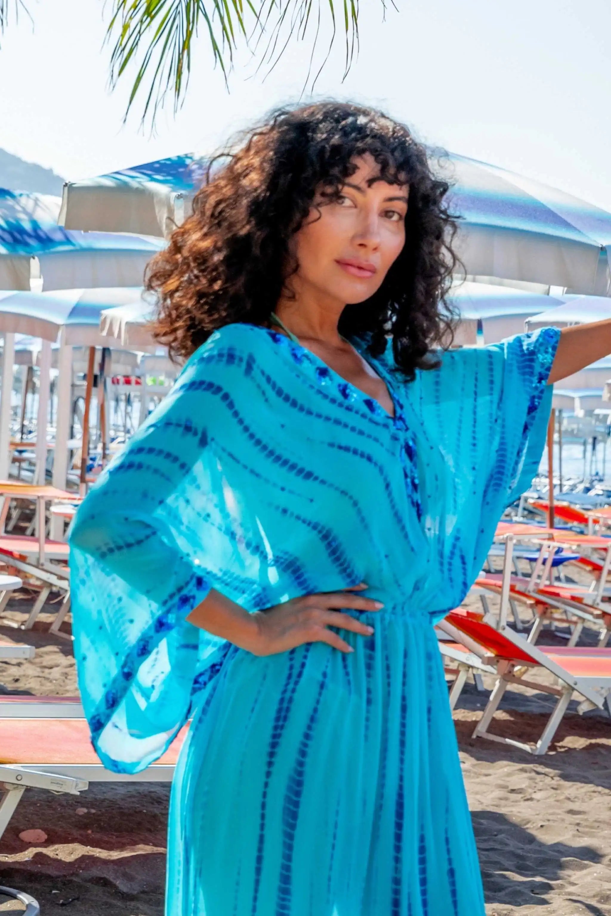 Made of beautifully breathable silk georgette, our silk kaftan fabric feels incredibly soft and smooth on the skin, it really does have a luxurious touch. Despite its semi sheer matt appearance, when dyed in these beautiful blue tones and the hand tie dye techniques we use at Lindsey Brown resort wear, it is not overly see-through. You may be able to see the silhouette of a bikini underneath. Our clever use of vertical tie dye patterns and vibrant colours will provide just the right balance of modesty and elegance. The silk fabric’s light breathable nature makes it so comfortable to wear in hot and humid weather. You will feel so comfortable when wandering around your resort in the mid-day sun or when wearing silk kaftans for sunset cocktails at the beach bar.